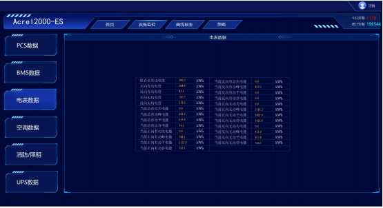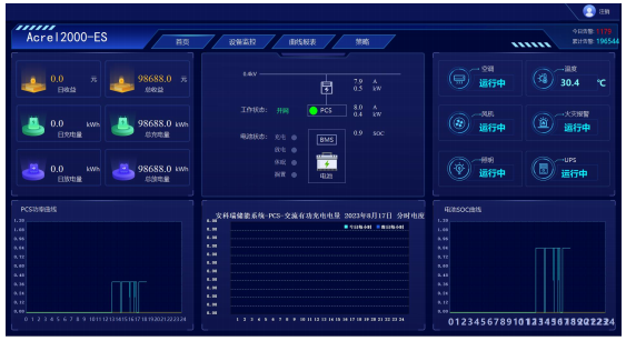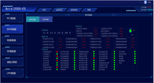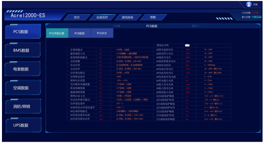 PCS监控:满足储能变流器的参数与限值设置;运行模式设置;实现储能变流器交直流侧电压、电流、功率及充放电量参数的采集与展示;实现PCS通讯状态、启停状态、开关状态、异常告警等状态监测。