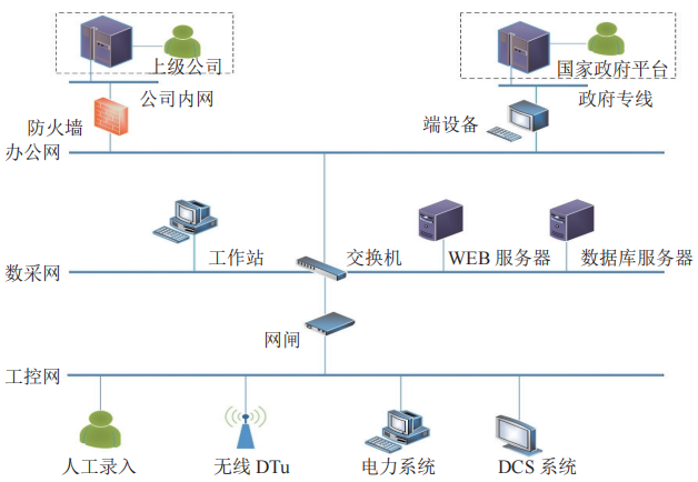 如图 3 所示,整个拓扑网络主要包含工控网、数采网、办公网、政府专线。工控网主要负责电力、DCS等系统的实时通讯,无法接入现有DCS控制系统的仪表、未连入电力后台的电能表、地理位置偏僻不方便联网的仪表,通过 DTU 连接仪表进行数据采集。数采网包含WEB服务器、数据库服务器、工作站等硬件设施,主要负责工控网数据采集、计算、处理、存储、应用等数据服务。整个系统软件平台部署在办公网上,通过Web应用服务器以B/和S架构形式进行发布,上级公司和公司用户通过浏览器连接办公网进行访问和使用。为保证数据和网络的安全性,公司通过端设备和网络专线向国家平台发送相应的指标参数,并根据政府要求与政府平台进行对接,满足国家和地方政府能源监管需求。