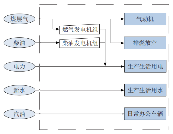 案例企业所消耗的能源包括煤层气、电力、柴油、汽油和新水;其中,电力和新水是公司购入的主要能源。煤层气全部是自产自用,主要用于气动机及燃气发电机组;柴油主要用于柴油发电机组;电力大部分为外购所得,主要为生产生活供电,少部分通过燃气发电获得;新水通过市政管网供应;汽油为日常办公车辆所使用。用能系统如图1所示。