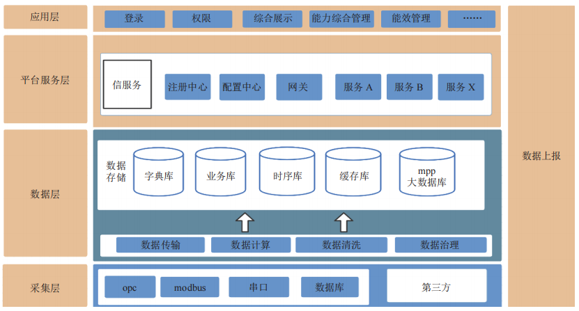 如图2所示,能耗在线监测系统分为四个层次,底层为数据采集层,包括OPC协议、Modbus协议、串口协议、数据库采集或第三方系统采集等。在采集数据的基础上建立数据传输、数据计算、数据清洗及数据治理使数据标准化,然后进行数据加工计算,形成方便应用的关系型数据库、时序数据、大数据。以数据为基础建立微服务平台,提供统一的网关入口,进行统一的认证,注册点对所有的API统一管理,配置点保存所有的配置数据,提供各种数据服务,为应用层提供支持。在平台服务层上为应用服务层,创建了丰富的应用服务,包括用户登录,权限管理,设备管理,数据可视化服务综合展示,能源综合管理,能耗实绩管理,能源报表管理等等。