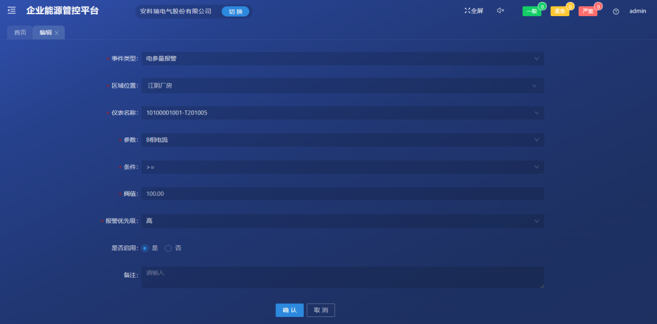 检测:对能源报警信息进行集中显示,可以对报警阈值信息进行相关处理操作,可以对报警参数进行在线设置,当能源参数越限报警,可提供报警重要性等级分类,具备APP推送、手机短信、邮件、钉钉、语音播报、系统弹窗等报警提示;