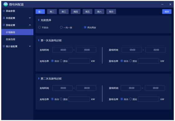 满足储能系统设备参数的配置、电价参数与时段的设置、控制策略的选择。目前支持的控制策略包含计划曲线、削峰填谷、需量控制等。