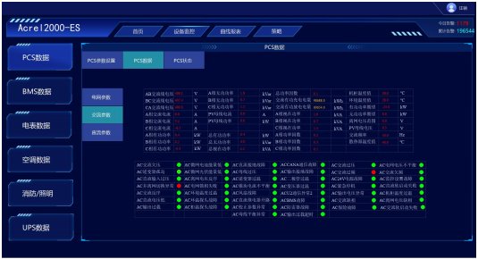 PCS监控:满足储能变流器的参数与限值设置;运行模式设置;实现储能变流器交直流侧电压、电流、功率及充放电量参数的采集与展示;实现PCS通讯状态、启停状态、开关状态、异常告警等状态监测。