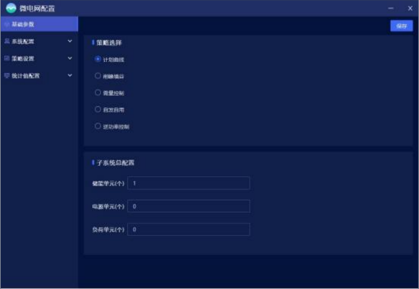 微电网配置主要对微电网系统组成、基础参数、运行策略及统计值进行设置。其中策略包含计划曲线、削峰填谷、需量控制、新能源消纳、逆功率控制等。